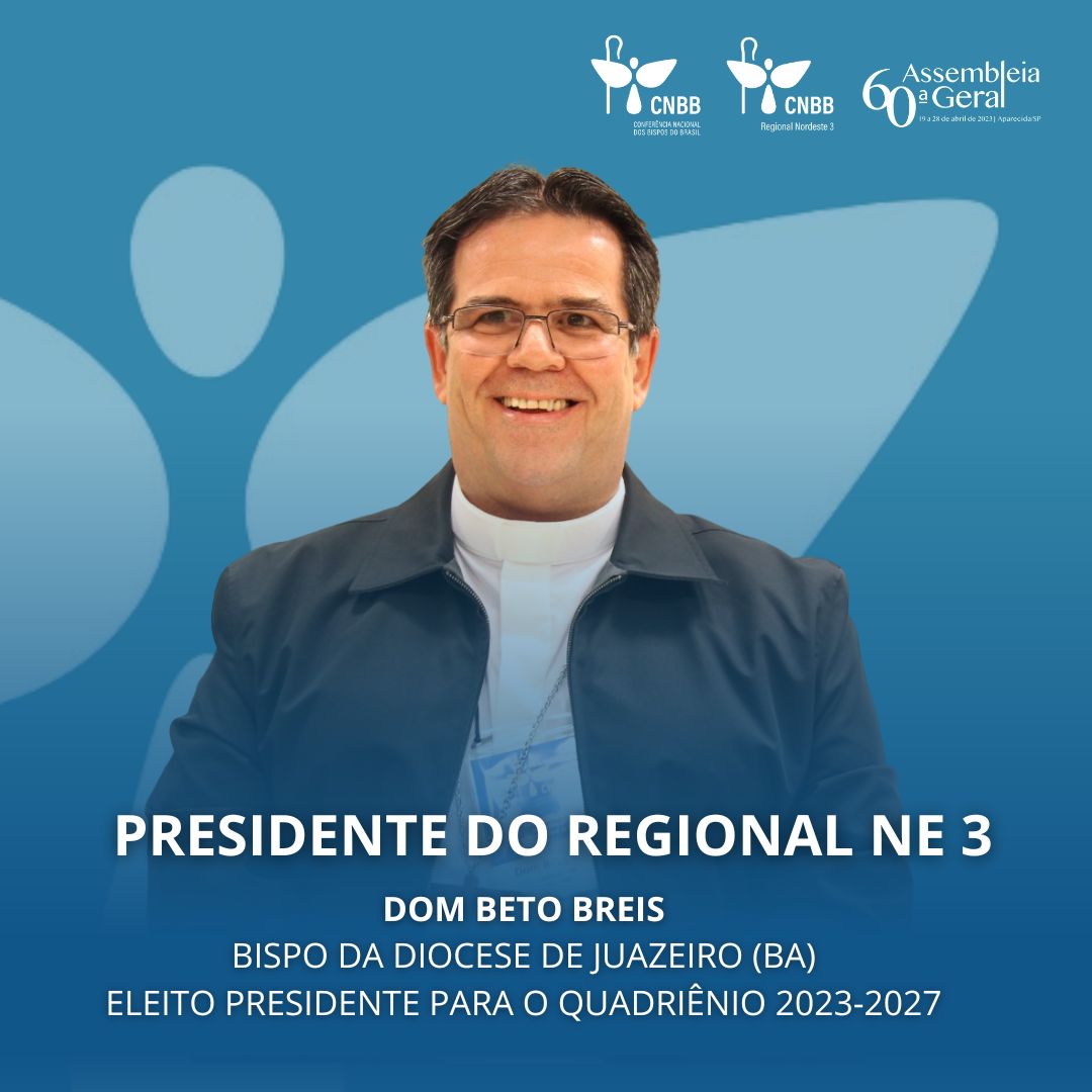 Dom Beto Breis, bispo da Diocese de Juazeiro (BA), foi eleito na tarde de hoje (26), como o novo presidente do Regional Nordeste 3 da Conferência Nacional dos Bispos do Brasil (CNBB). O episcopado das arquidioceses e dioceses da Bahia e de Sergipe também escolheu Dom Genivaldo Garcia, bispo da Diocese de Estância (SE), como vice-presidente, e Dom Dorival Barreto, bispo auxiliar da Arquidiocese de Salvador, como secretário.