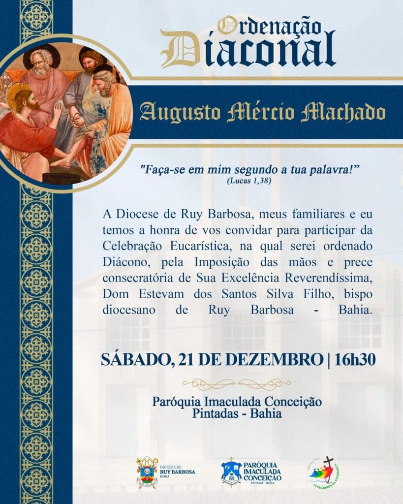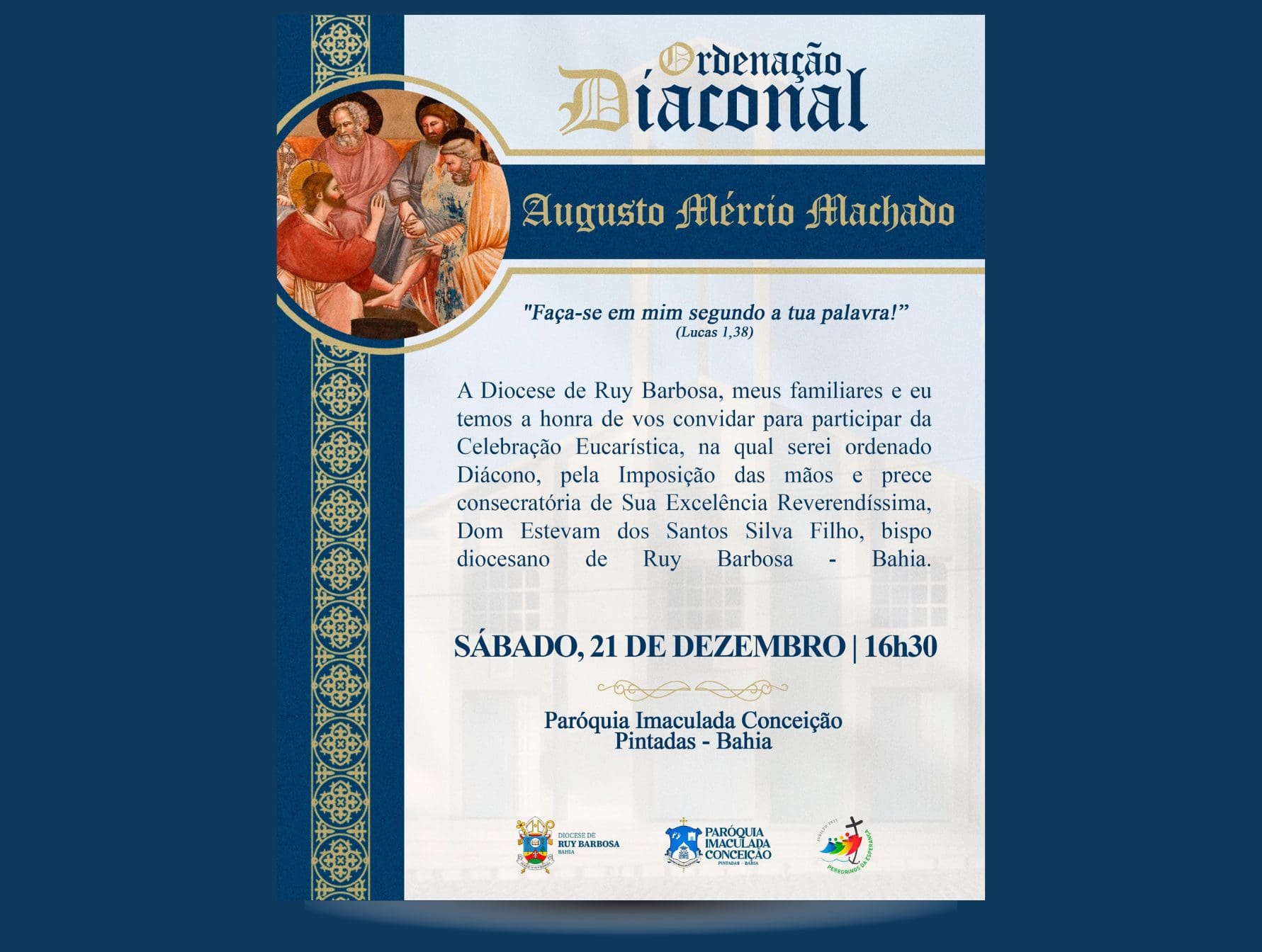 É com grande alegria que partilhamos o convite para a Celebração Eucarística com Rito de Ordenação Diaconal do Seminarista Augusto Mércio Machado que será presidida pelo nosso Bispo Diocesano, Dom Estevam dos Santos Silva Filho.
