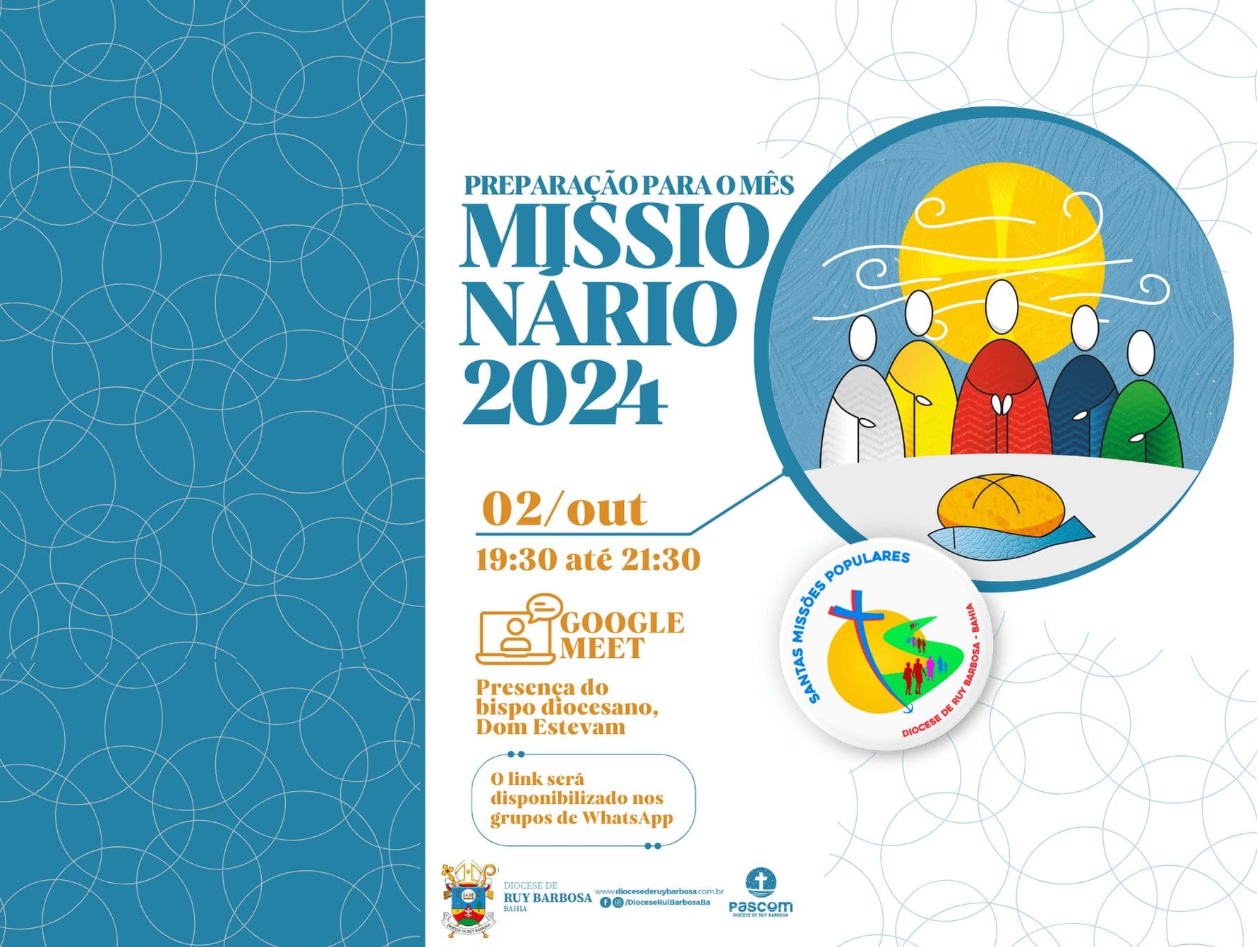 A Coordenação Diocesana das Santas Missões Populares convida todo o povo de Deus da Diocese de Ruy Barbosa para participar de um encontro, on – line, no dia 02 de outubro, às 19:30 em preparação ao mês missionário.