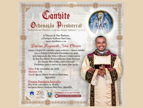 A Diocese de Ruy Barbosa, a Paróquia Senhora Sant’Ana, meus familiares e eu, Diácono Reginaldo Silva Oliveira temos a alegria de convidar vossa senhoria e ilustre família para a Solene Celebração Eucarística na qual, pela Imposição das Mãos e Oração Consecratória de Sua Excelência Reverendíssima Dom Estevam dos Santos Silva Filho, serei ordenado Presbítero para o serviço da Santa Mãe Igreja.