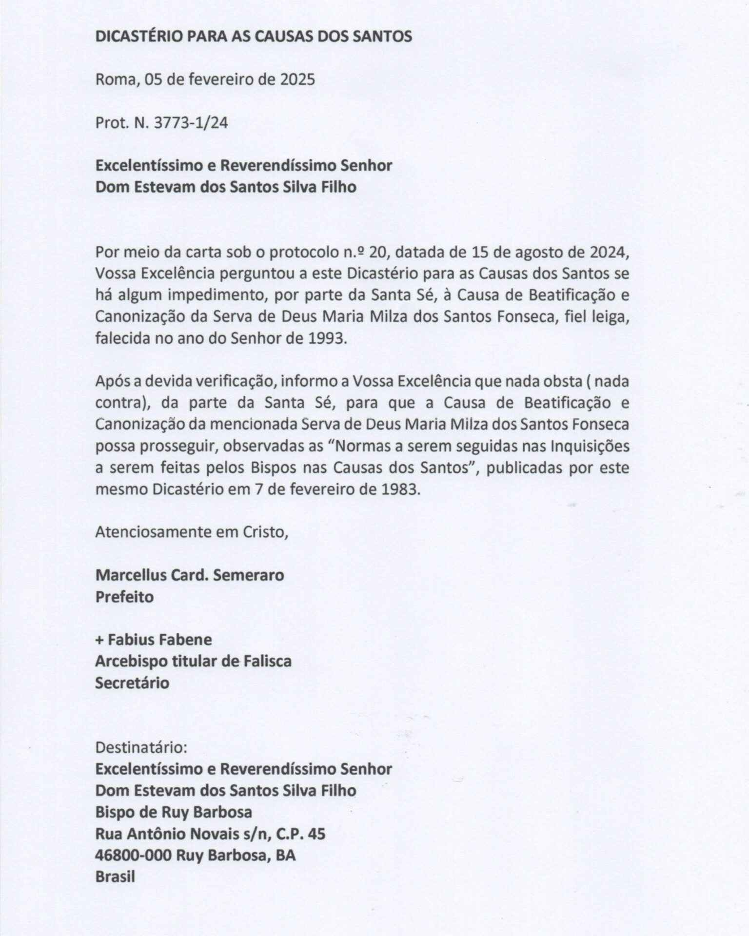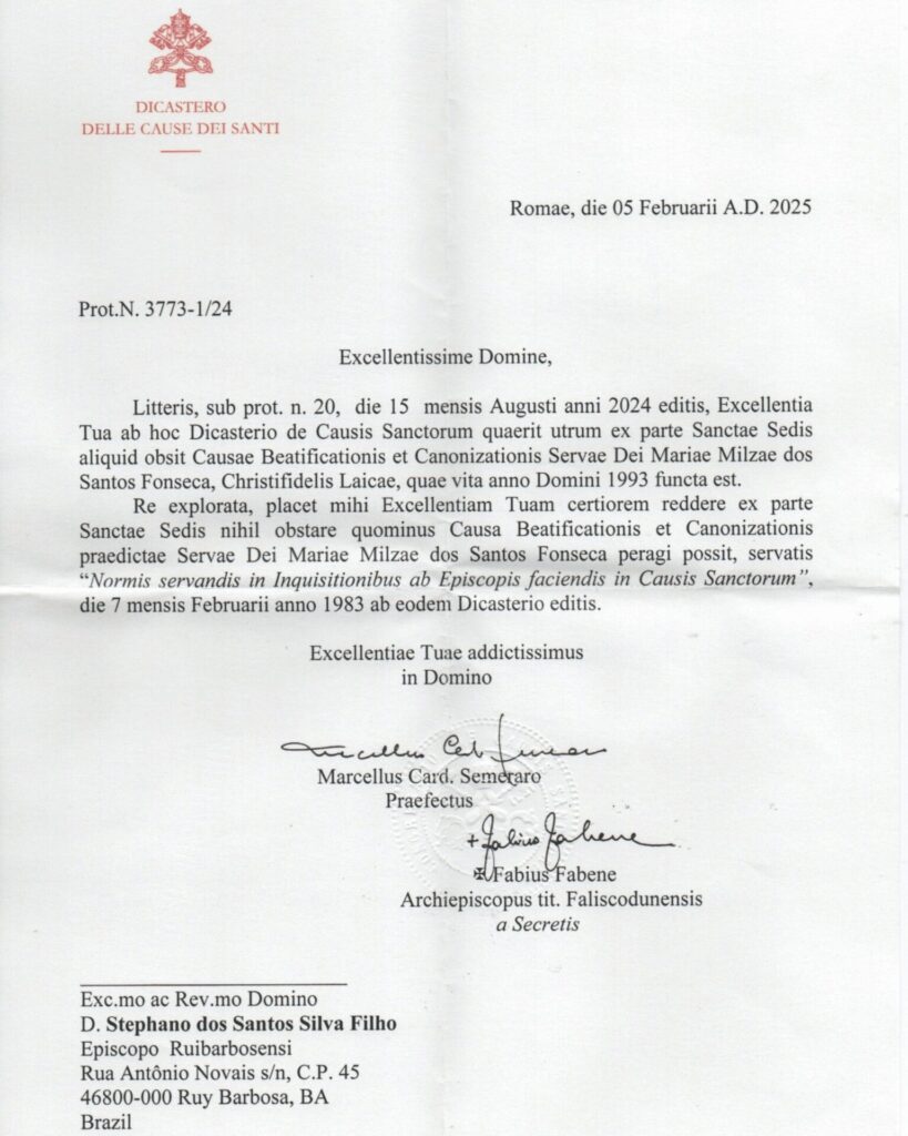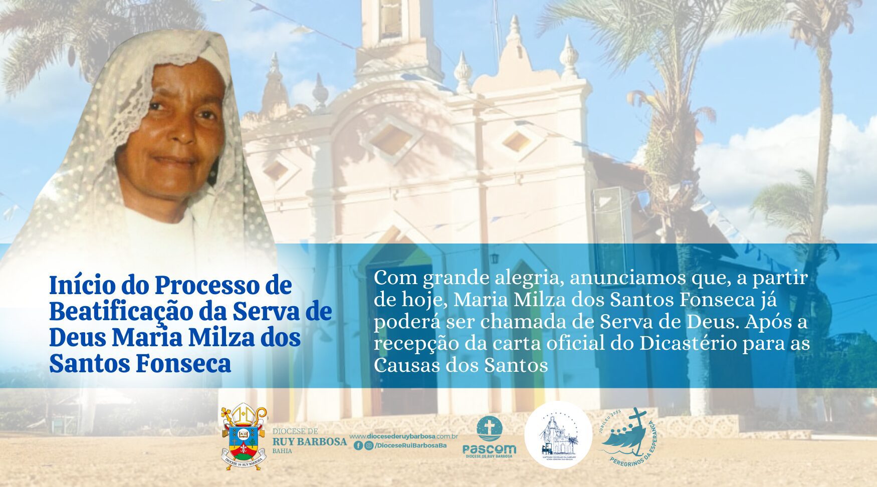 Com grande alegria, anunciamos que, a partir de hoje, 15 de abril de 2025, Maria Milza dos Santos Fonseca já poderá ser chamada de Serva de Deus. Após a recepção da carta oficial do Dicastério para as Causas dos Santos, assinada por Sua Eminência Cardeal Marcellus Semeraro, Prefeito da Congregação para as Causas dos Santos, o processo de Beatificação e Canonização de Maria Milza está oficialmente autorizado.