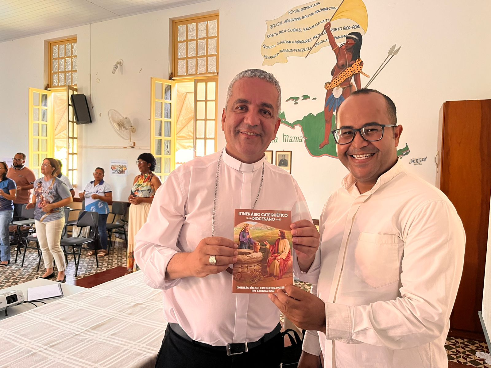 O bispo diocesano, dom Estevam, frisou a importância do catequista empenhar-se em uma catequese que fale a todos os corações, e recebeu das mãos do assessor eclesiástico para catequese, pe. Roquelino Lomes, um exemplar do Itinerário Catequético Diocesano.