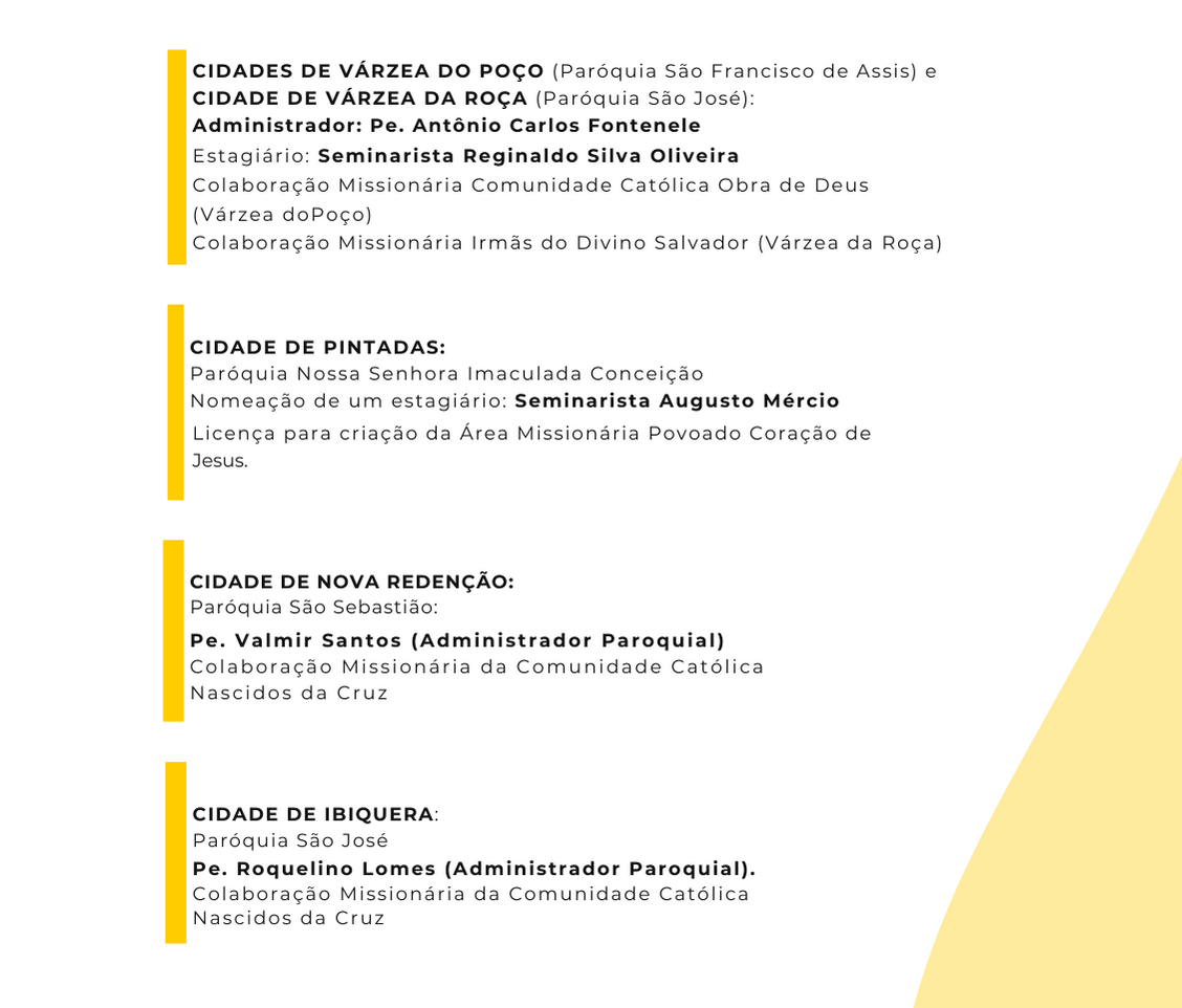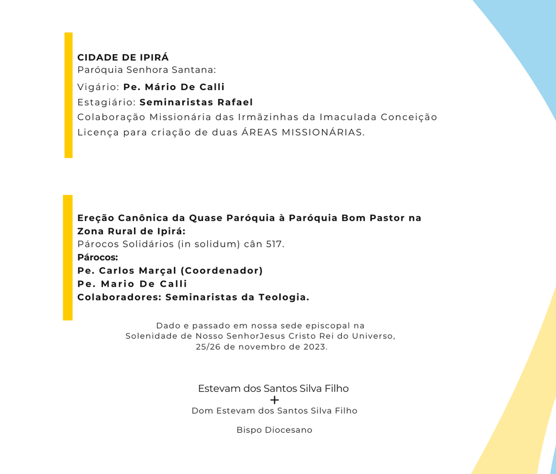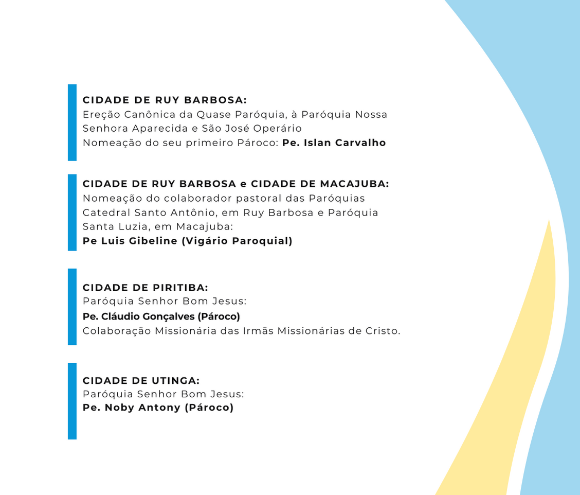 Considerando as necessidades pastorais e a adequada distribuição dos ofícios eclesiásticos, seguindo o que prescreve a disciplina da Igreja, o direito particular e os legítimos costumes de nossa Diocese de Ruy Barbosa, após oração, diálogo e discernimento, tendo ouvido o parecer favorável dos pastores e do Conselho Presbiteral, comunicamos as seguintes ereções canônicas, transferências e nomeações.