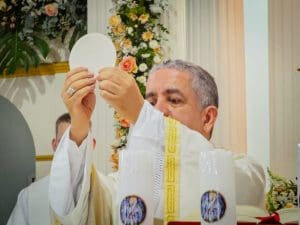 A imposição das mãos e a oração consecratória são momentos centrais da ordenação, que remontam aos Apóstolos. Este ato representa a transmissão do ministério apostólico e a missão que o sacerdote assume de ser um instrumento da graça e do amor de Deus no mundo. Reginaldo, ao receber a imposição das mãos com a oração de consagração, torna-se um sinal vivo do amor de Cristo. Que o Espírito o fortaleça e capacite a estar próximo das pessoas, mostrando-lhes o rosto misericordioso e compassivo de Deus.