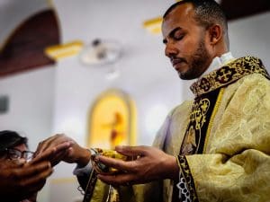 No momento da unção, as mãos do novo padre são ungidas com o óleo do Crisma, um perfume sagrado que o consagra a Deus. Como Isaías nos lembra, é o Espírito do Senhor que unge para anunciar a Boa Nova aos pobres e consolar os que choram. A unção das mãos é um sinal de que o sacerdote pertence ao Senhor, escolhido para a missão de Cristo e para levar o perfume da presença divina ao mundo. Diácono Reginaldo, hoje você recebe este perfume espiritual que o consagra a Deus e ao serviço de seu povo. Que suas mãos levem sempre o consolo e a esperança do amor de Deus a todos os que mais necessitam.