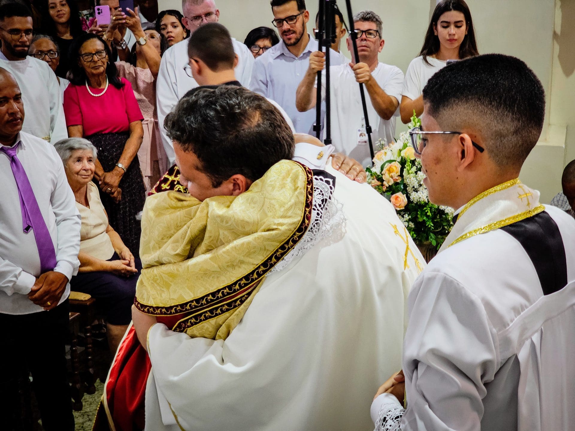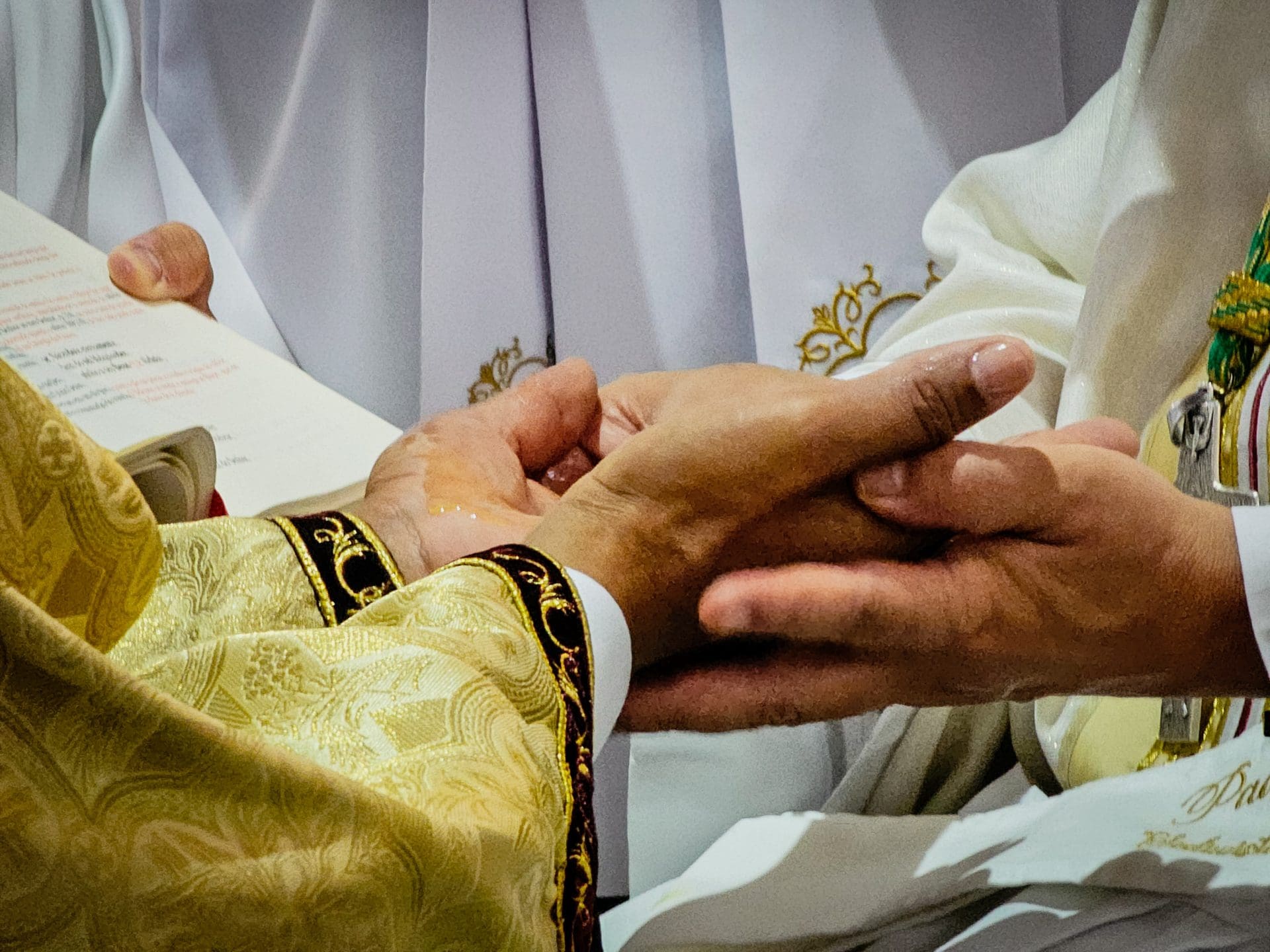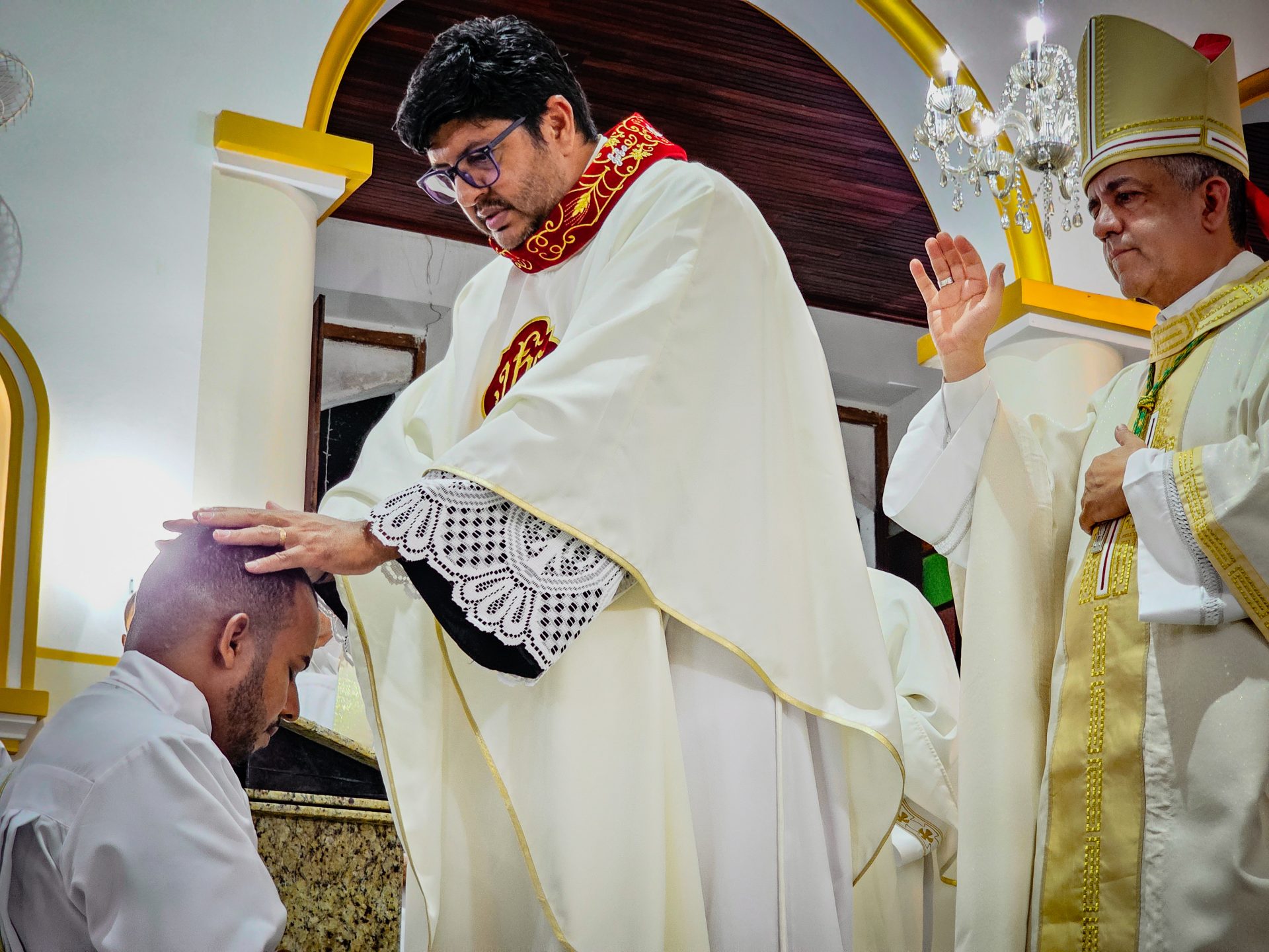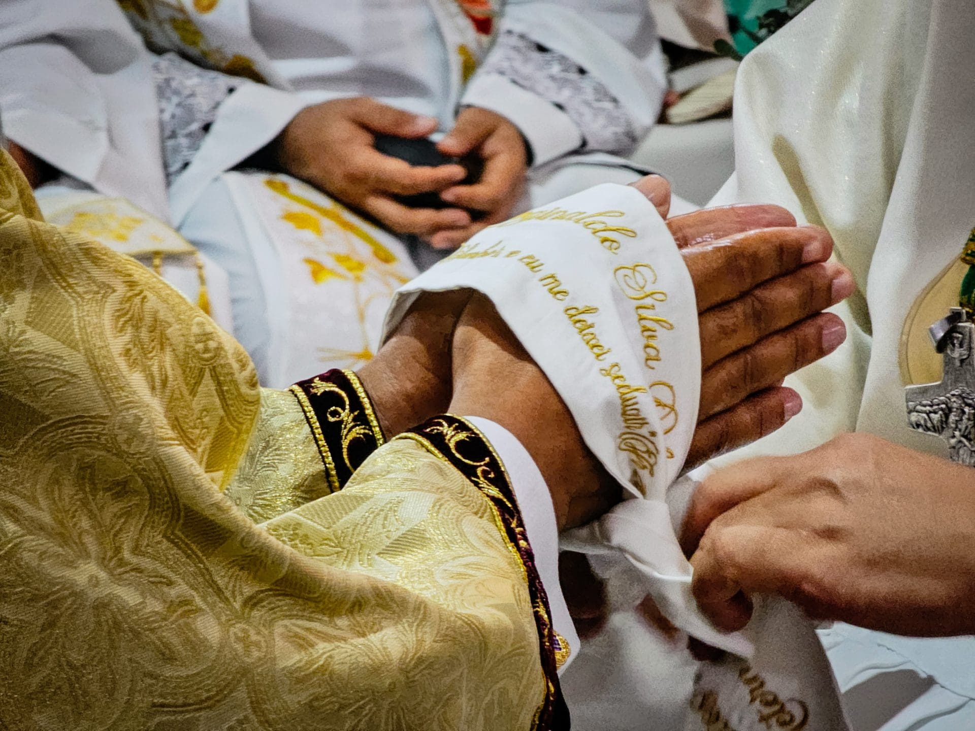 A imposição das mãos e a oração consecratória são momentos centrais da ordenação, que remontam aos Apóstolos. Este ato representa a transmissão do ministério apostólico e a missão que o sacerdote assume de ser um instrumento da graça e do amor de Deus no mundo. Reginaldo, ao receber a imposição das mãos com a oração de consagração, torna-se um sinal vivo do amor de Cristo. Que o Espírito o fortaleça e capacite a estar próximo das pessoas, mostrando-lhes o rosto misericordioso e compassivo de Deus.