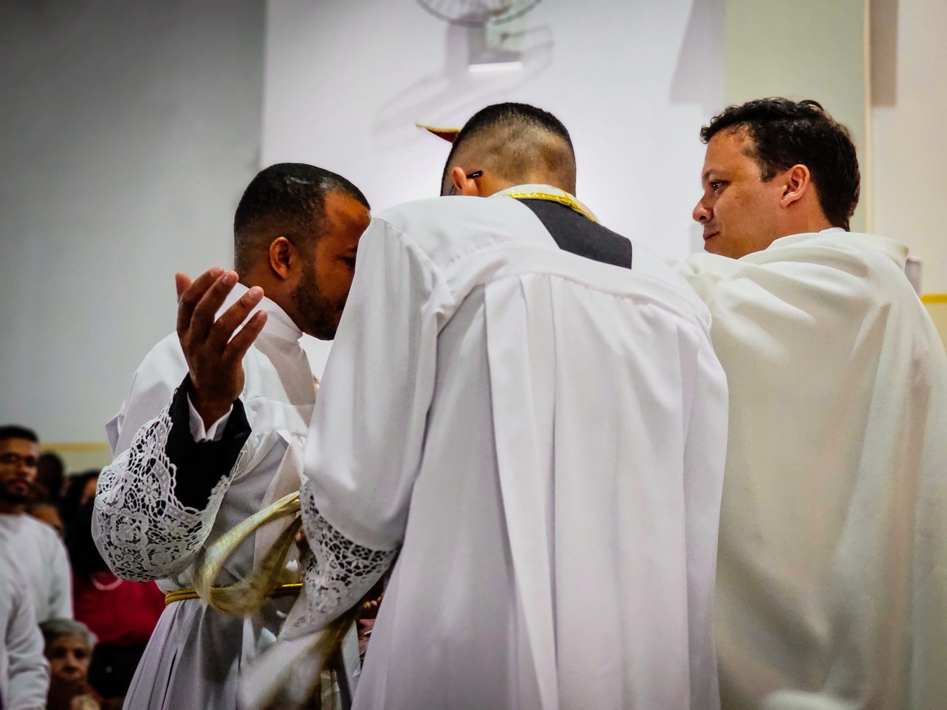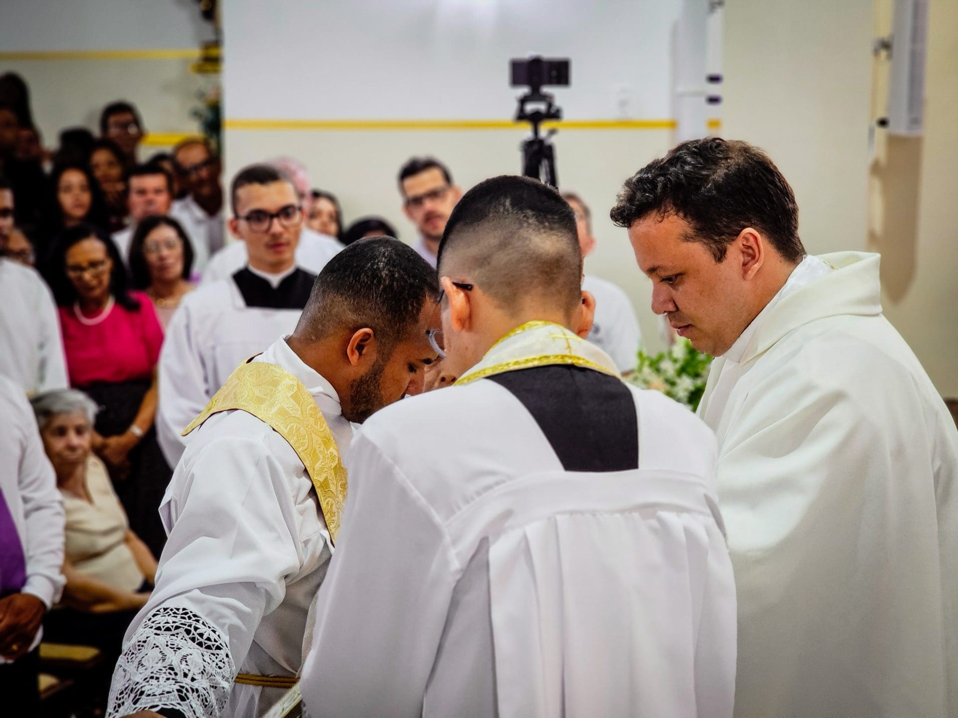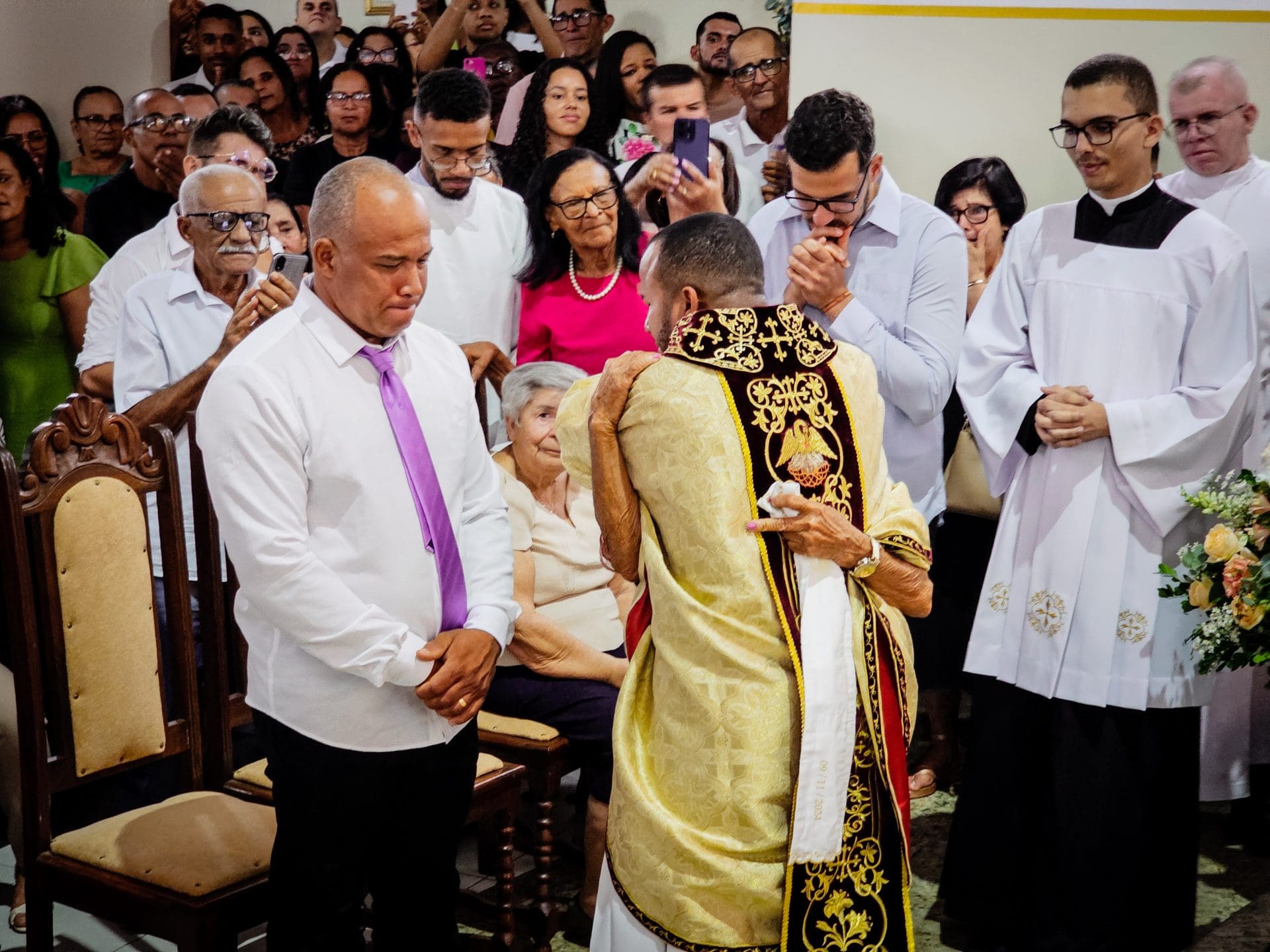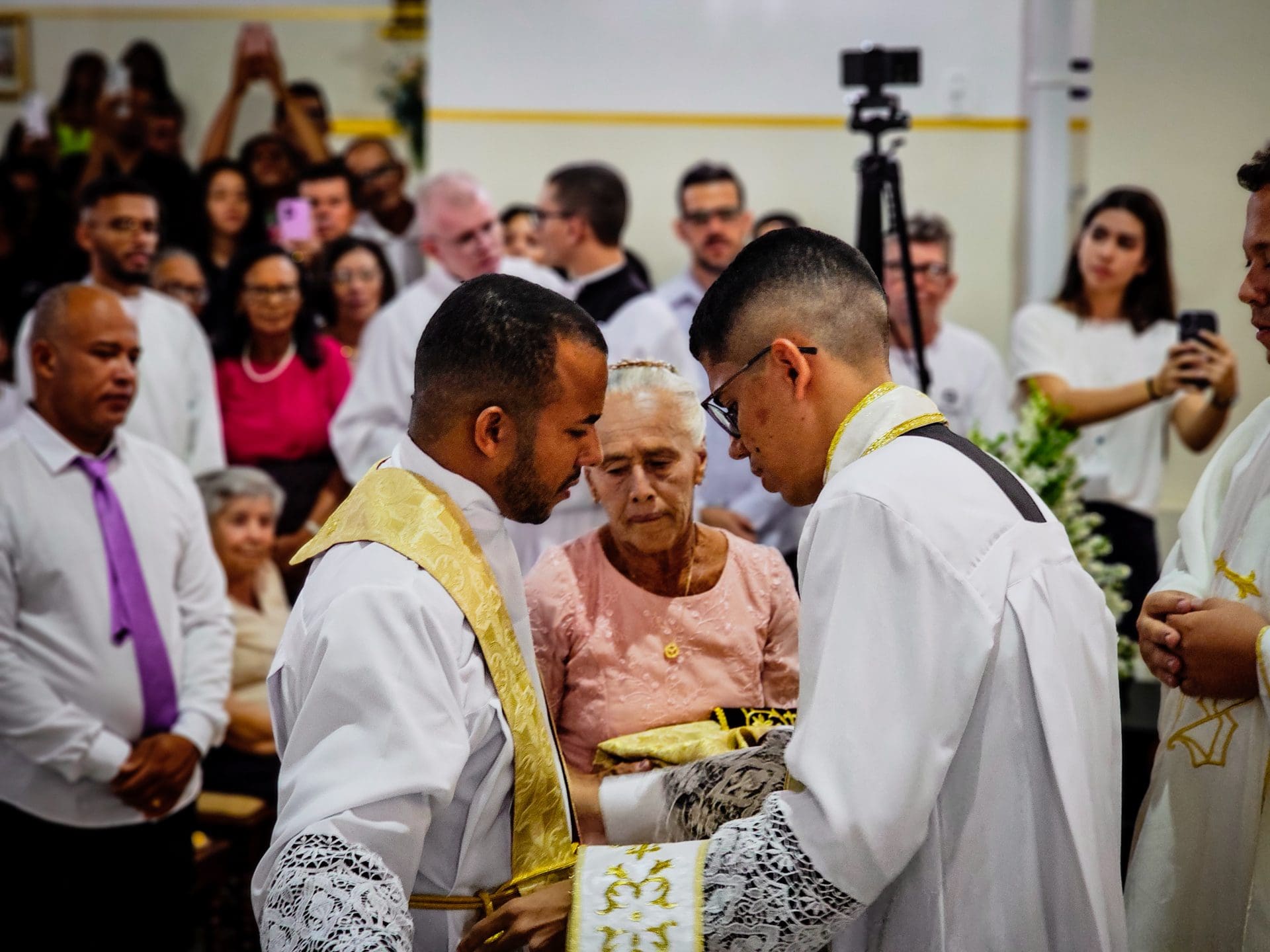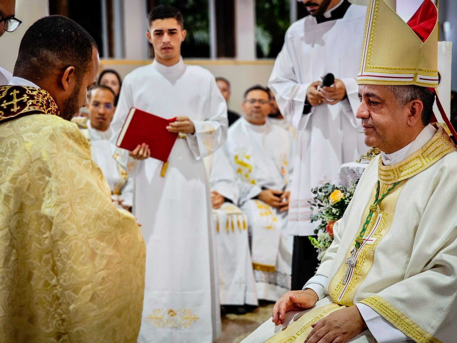 A imposição das mãos e a oração consecratória são momentos centrais da ordenação, que remontam aos Apóstolos. Este ato representa a transmissão do ministério apostólico e a missão que o sacerdote assume de ser um instrumento da graça e do amor de Deus no mundo. Reginaldo, ao receber a imposição das mãos com a oração de consagração, torna-se um sinal vivo do amor de Cristo. Que o Espírito o fortaleça e capacite a estar próximo das pessoas, mostrando-lhes o rosto misericordioso e compassivo de Deus.