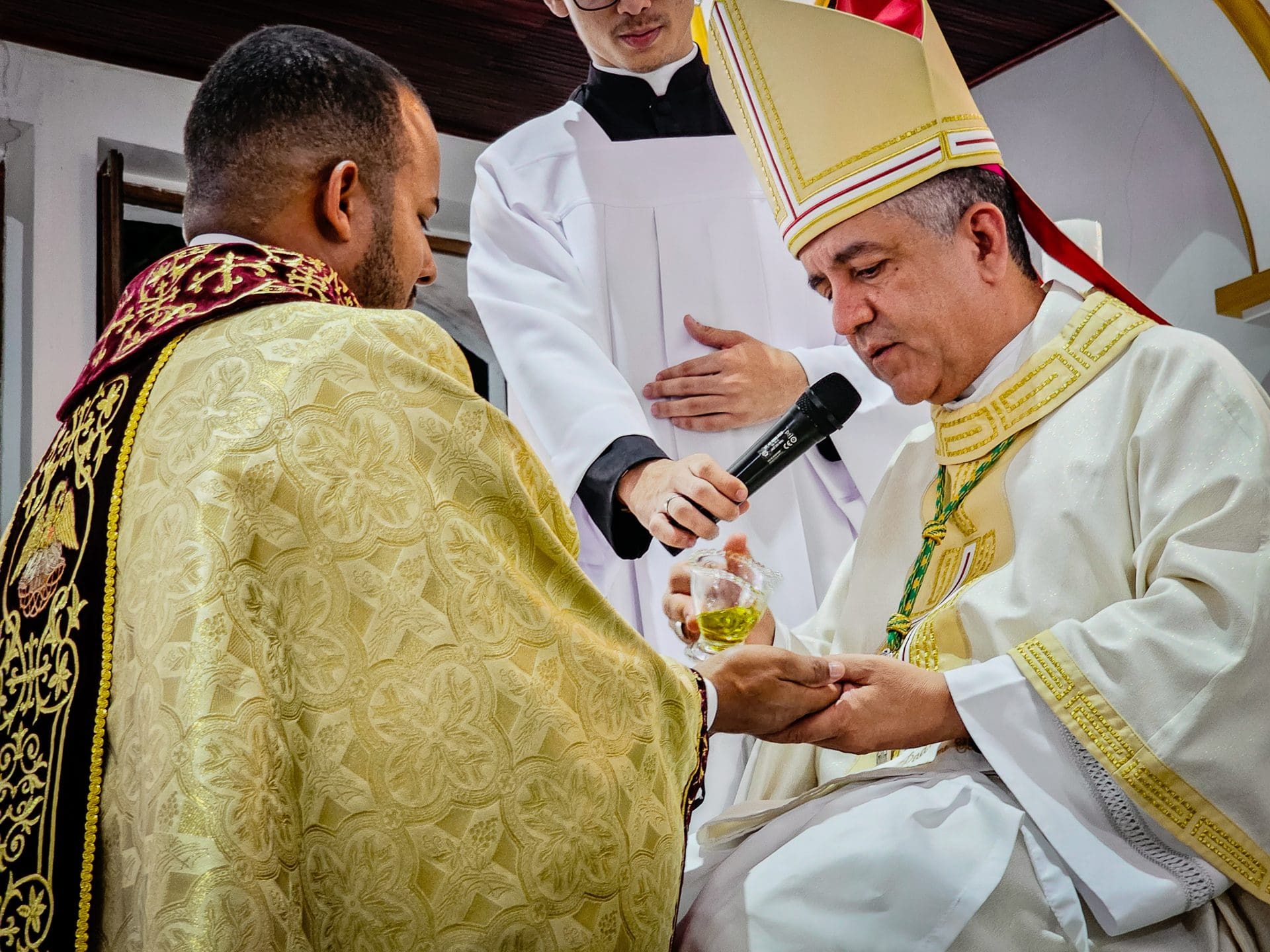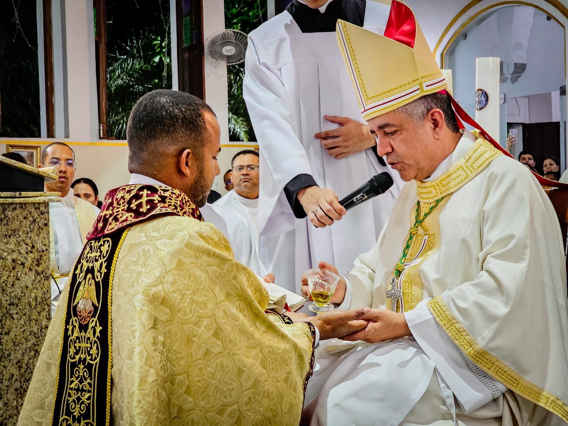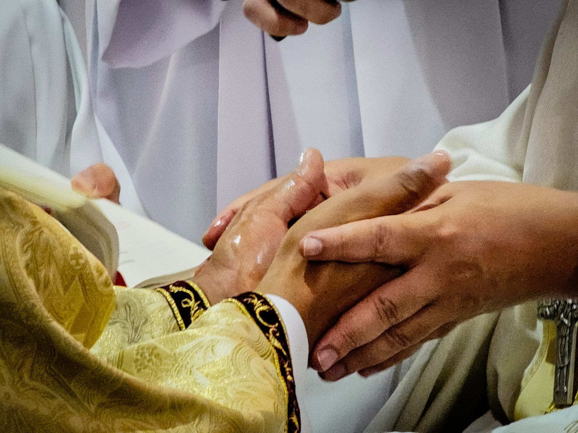 No momento da unção, as mãos do novo padre são ungidas com o óleo do Crisma, um perfume sagrado que o consagra a Deus. Como Isaías nos lembra, é o Espírito do Senhor que unge para anunciar a Boa Nova aos pobres e consolar os que choram. A unção das mãos é um sinal de que o sacerdote pertence ao Senhor, escolhido para a missão de Cristo e para levar o perfume da presença divina ao mundo. Diácono Reginaldo, hoje você recebe este perfume espiritual que o consagra a Deus e ao serviço de seu povo. Que suas mãos levem sempre o consolo e a esperança do amor de Deus a todos os que mais necessitam.