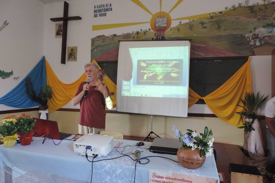 Dessa forma, passou a analisar a sociedade atual, seus rumos e dilemas. Fez a “Análise de Conjuntura” referindo-se ao momento atual, disse que é importante decifrar o que está acontecendo por trás dos “jogos de cena” onde aparecem os “agentes visíveis”: políticos, policiais, juízes, comunicadores, líderes sociais, agentes religiosos, pois eles anunciam projetos e visões que cada classe procura impor como se fossem válidos para toda a sociedade. Estes estão em constante mutação num cenário “político-parlamentar-judiciário-mediático-econômico” sem rumo, indefinido e surpreendente a cada dia. Vem a PEC 241 “injusta e seletiva” atingindo os pobres. Há reações na sociedade civil, sobretudo nos estudantes que ocupam Escolas, Universidades e ruas para dizer que pensam um Brasil diferente. Nós como Igreja, que atitudes tomar?